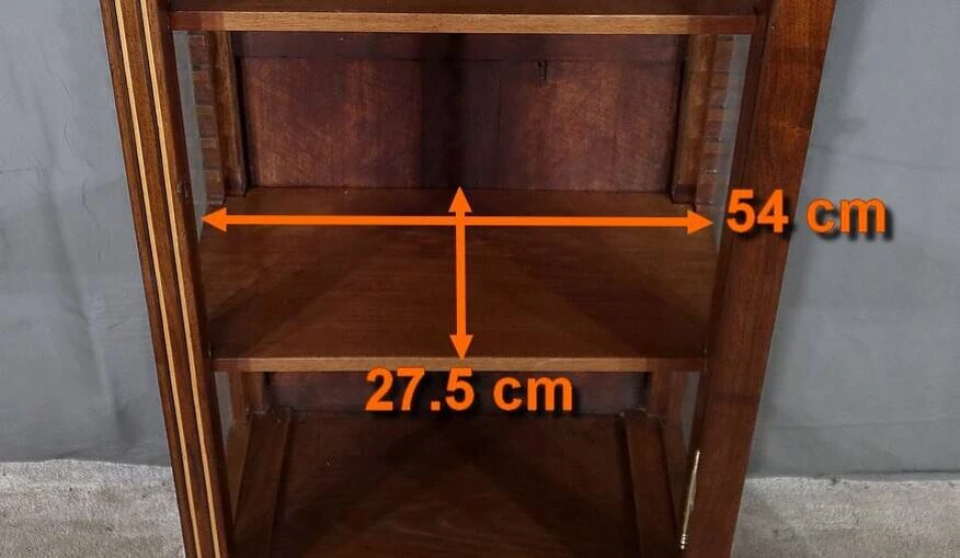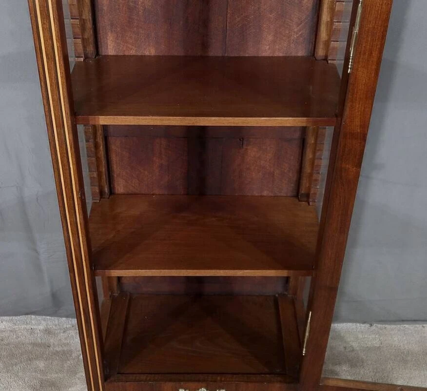 Small all-sided display case in mahogany veneer decorated with marquetry of rosewood, light wood, rosewood and ebony.