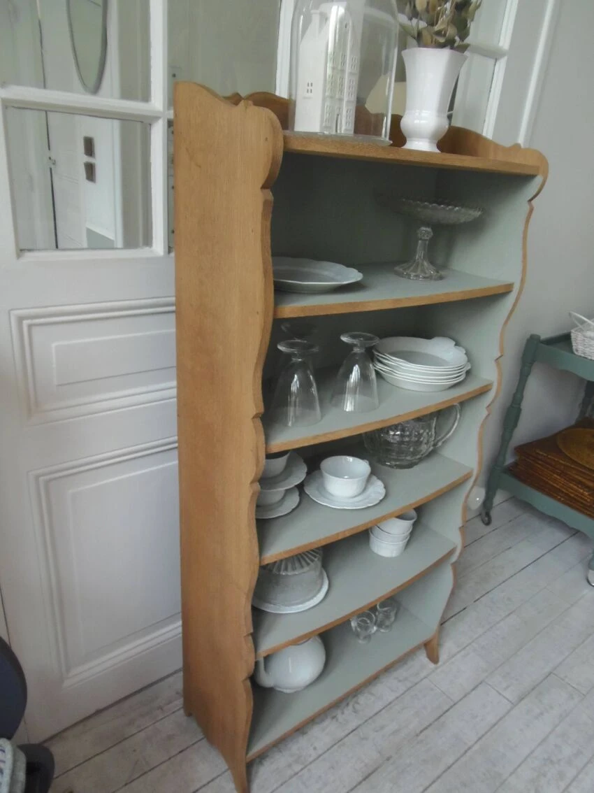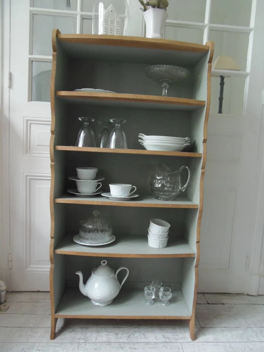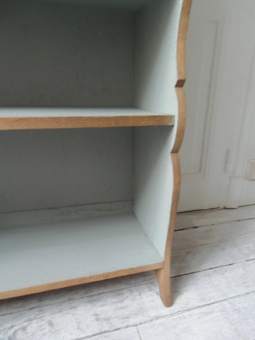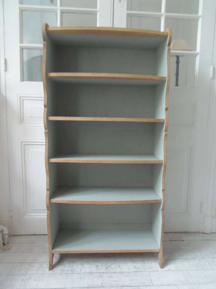Small vintage bookcase, 5 fixed shelves, interior sublimated in verdigris, waxed finish.