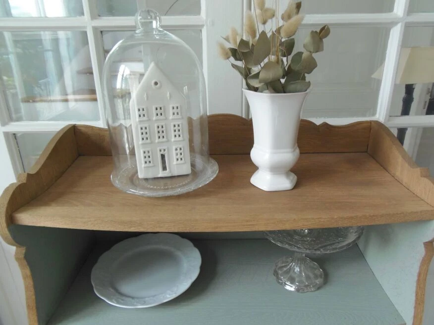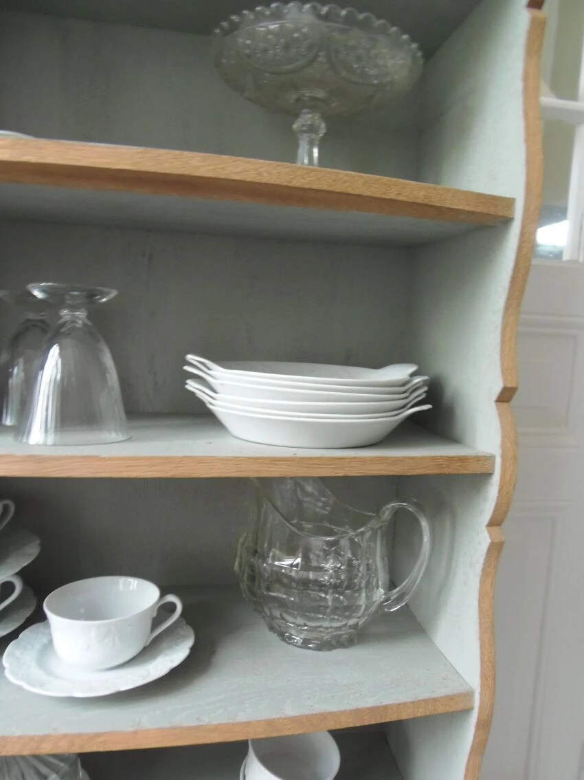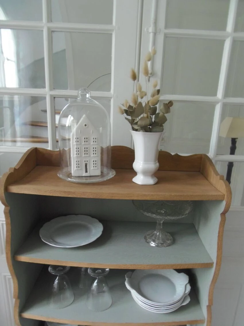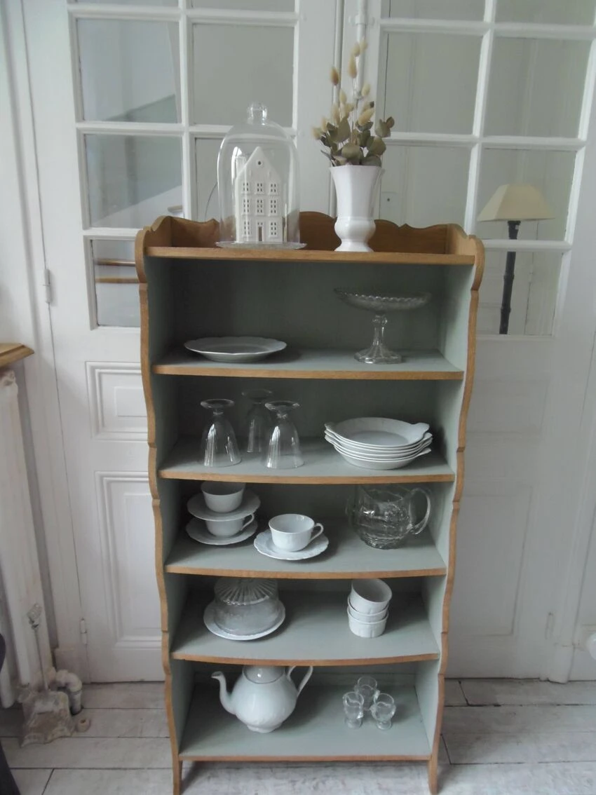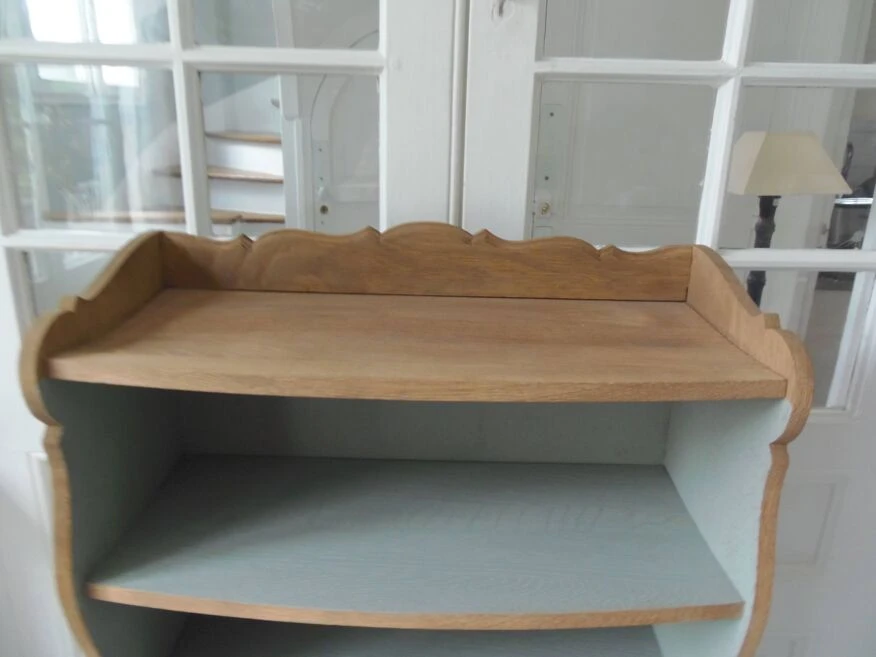 Small vintage bookcase, 5 fixed shelves, interior sublimated in verdigris, waxed finish.