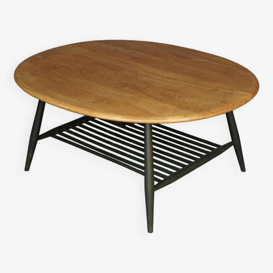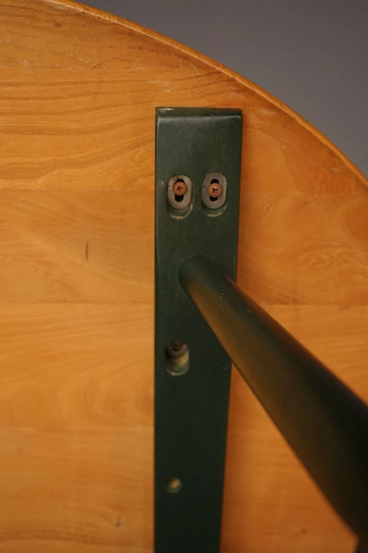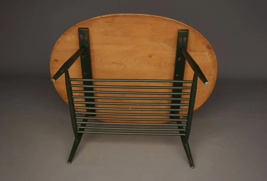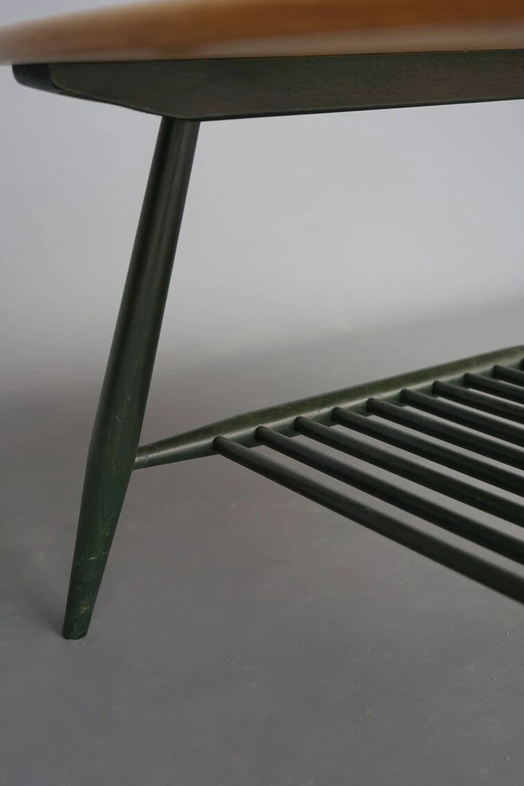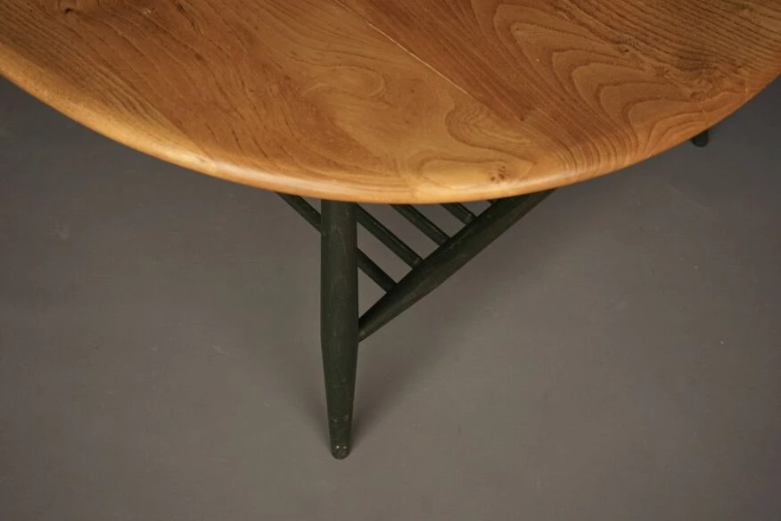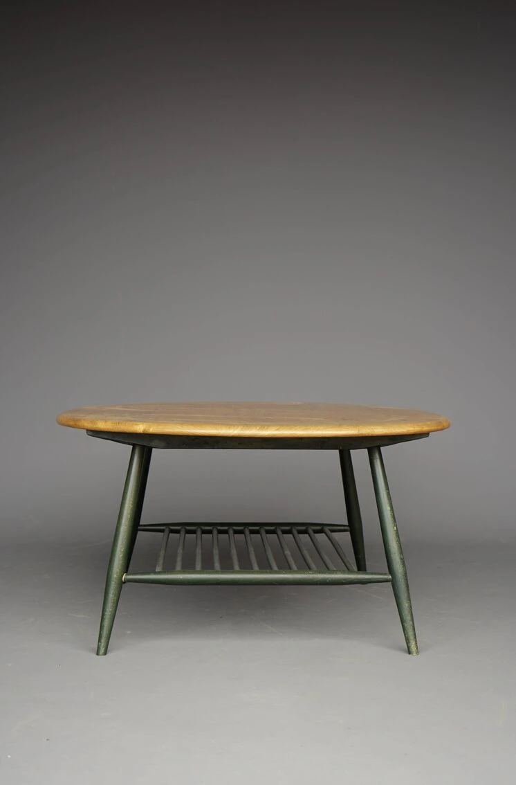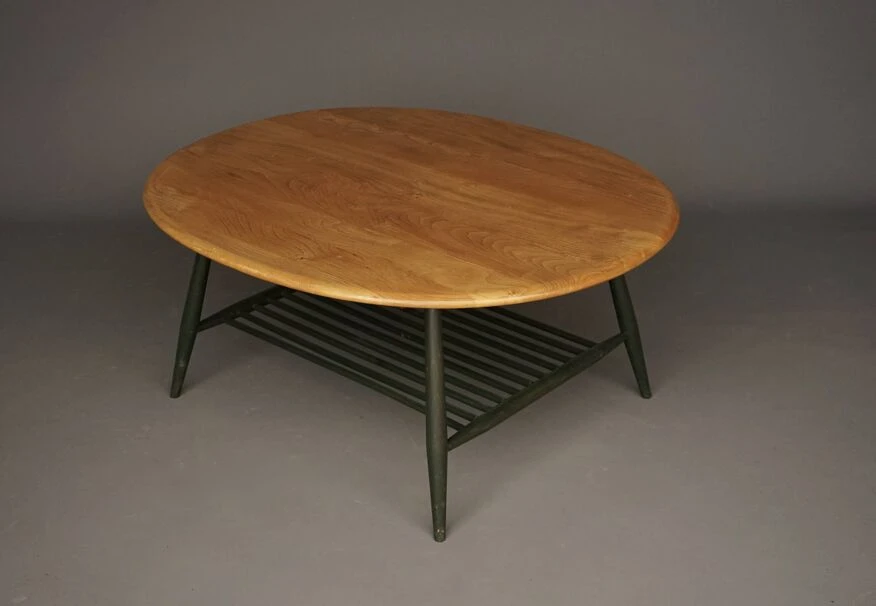 Une table basse rare avec un plateau en forme d’orme et des pieds en hêtre teinté vert. Usure superficielle minime (principalement au niveau des jambes).