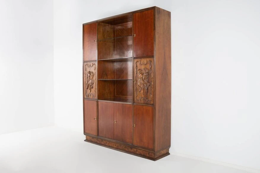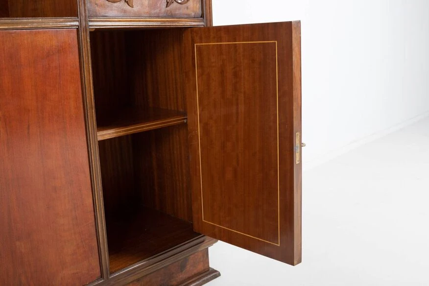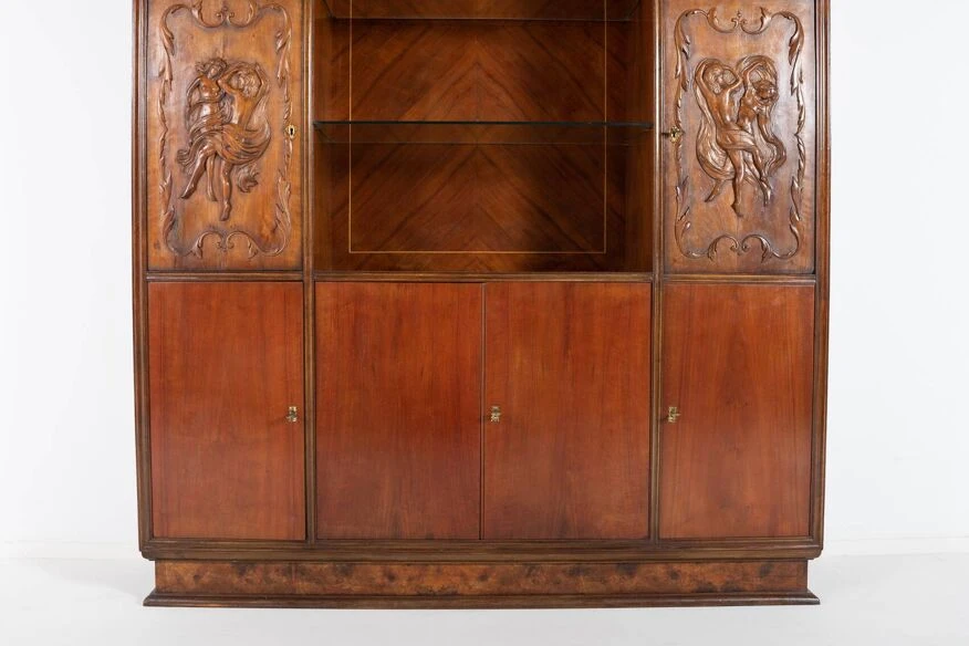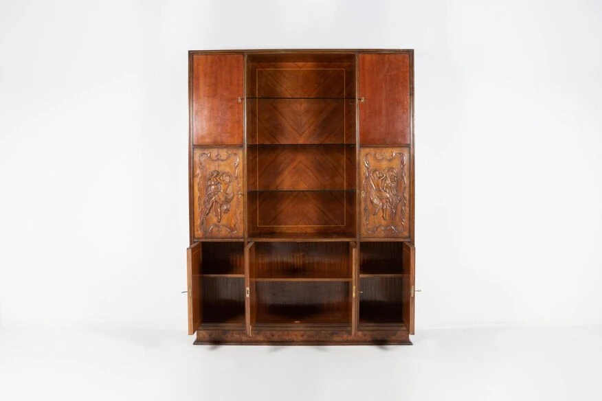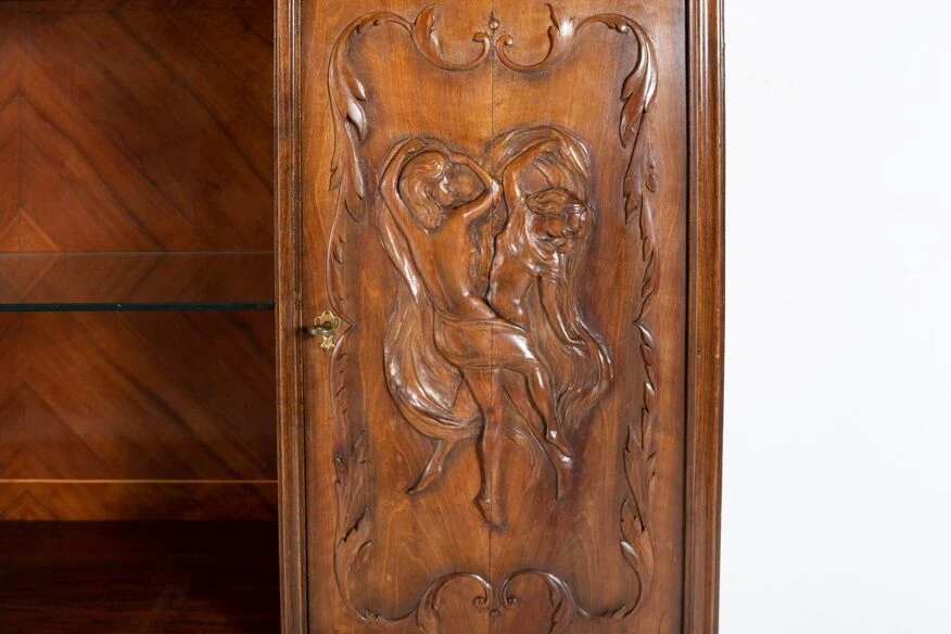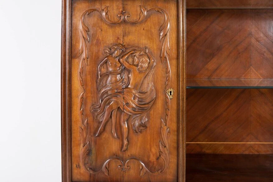 Beautiful italian cabinet in spectacular veneer finish and wood carvings on two doors.