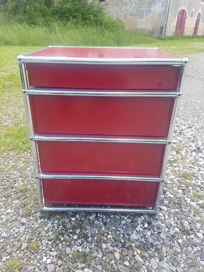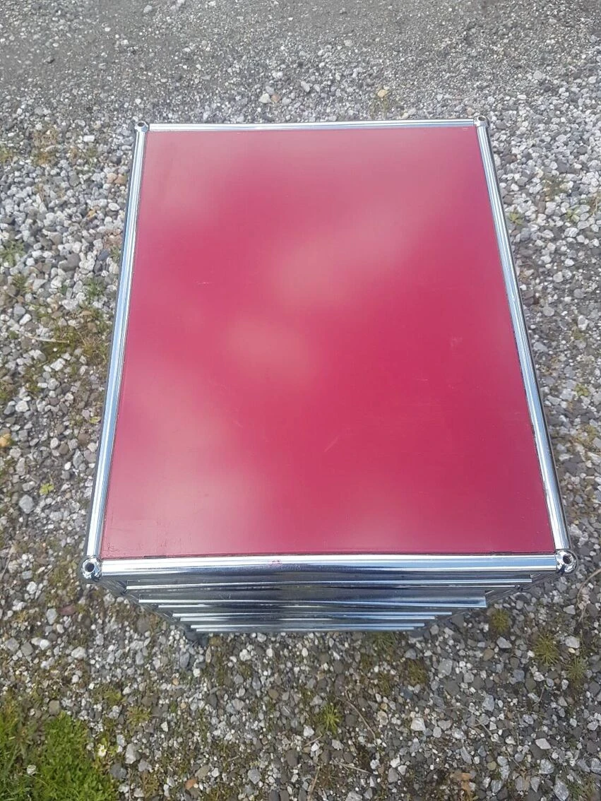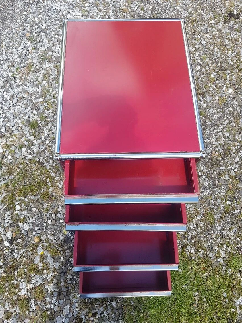 Very beautiful USM HALLER furniture in beautiful vintage condition. 4 drawers, 1 of which opens easily but no longer has guide rails. The other 3 drawers work perfectly. Beautiful red color, chrome in good condition and some light scratches on the top. Very decorative, practical and quite heavy piece of furniture. Dimensions: 52 deep, 42 wide and 67 cm high.