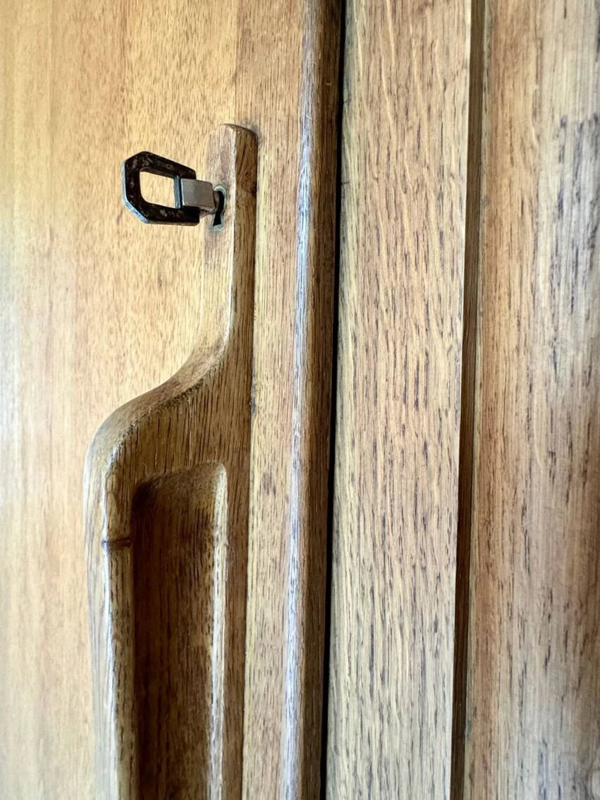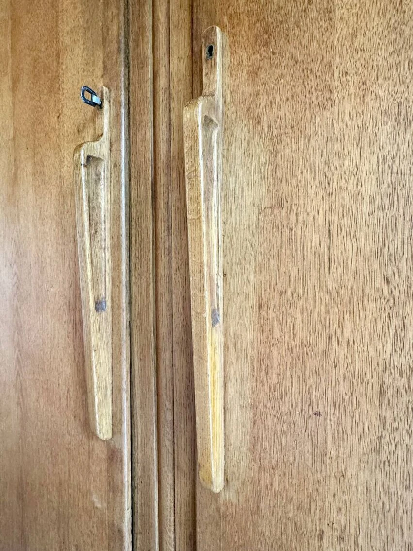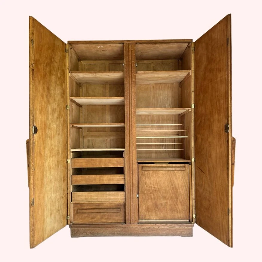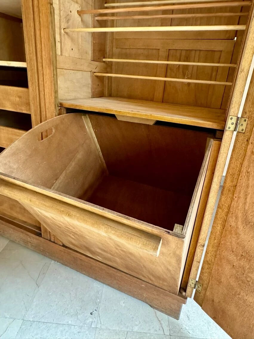 Straight out of the Hôtel Royal on the Promenade des Anglais in Nice, this large Marcel Gascoin wardrobe for Arhec is exceptional. Immediately recognizable thanks to its long handles found on the AA cabinet by Marcel Gascoin, it is made of wood and dates from the 1950s. It offers an astonishing storage capacity. This large vintage storage linen cabinet is broken down as follows: – two large doors which close with magnets and lock. – On the left side: 4 shelves (not adjustable in height) and 4 drawers, the last of which is higher and has a wooden handle. – On the right side: 3 shelves (not adjustable in height), 1 space with wooden rods intended for storing shoes, a removable wooden laundry basket in the lower part. Completely cleaned, nourished and treated, this piece of furniture is perfectly healthy and immediately usable as is. In very good condition, the wood is not scratched and the entire interior is clean. Stable, robust and functional, it is of remarkable size and will be perfect for a large bedroom for example. A letterhead from the Royal Hotel in Nice with an inventory from April 16, 1956 was taped to the inside of a door. Please note that the furniture is completely removable. It can therefore be delivered assembled or disassembled according to your needs. Height: 218 cm Width: 140 cm Depth: 60 cm