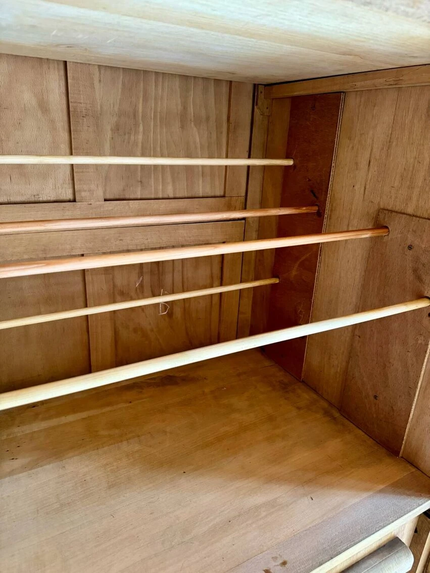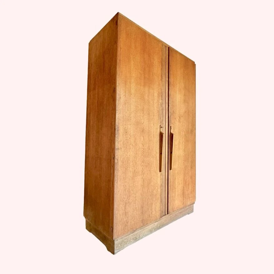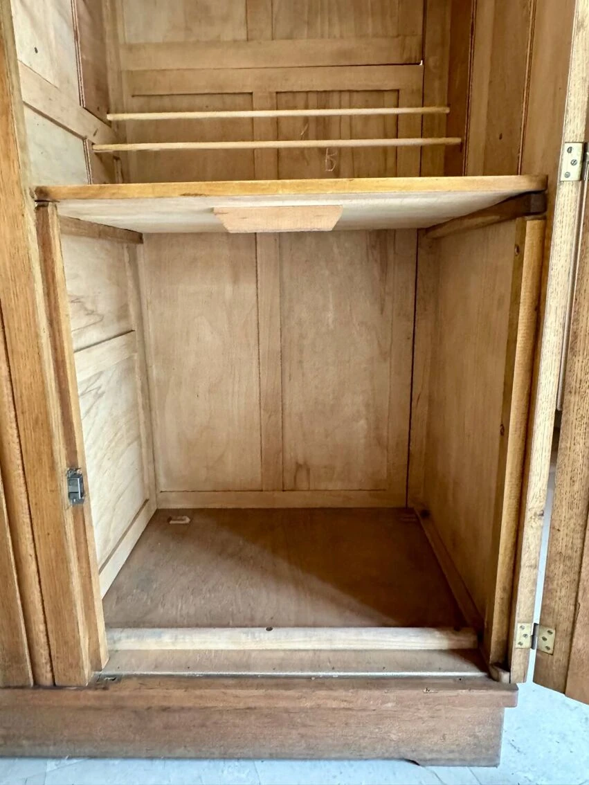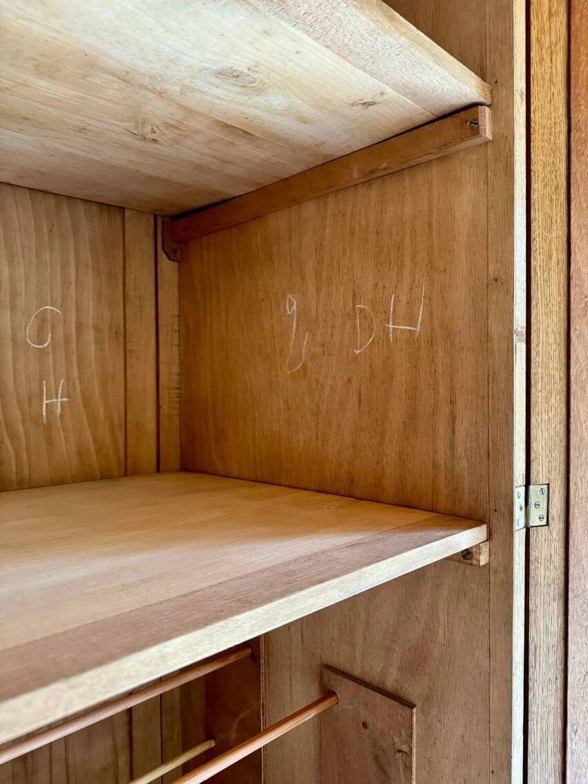 Straight out of the Hôtel Royal on the Promenade des Anglais in Nice, this large Marcel Gascoin wardrobe for Arhec is exceptional. Immediately recognizable thanks to its long handles found on the AA cabinet by Marcel Gascoin, it is made of wood and dates from the 1950s. It offers an astonishing storage capacity. This large vintage storage linen cabinet is broken down as follows: – two large doors which close with magnets and lock. – On the left side: 4 shelves (not adjustable in height) and 4 drawers, the last of which is higher and has a wooden handle. – On the right side: 3 shelves (not adjustable in height), 1 space with wooden rods intended for storing shoes, a removable wooden laundry basket in the lower part. Completely cleaned, nourished and treated, this piece of furniture is perfectly healthy and immediately usable as is. In very good condition, the wood is not scratched and the entire interior is clean. Stable, robust and functional, it is of remarkable size and will be perfect for a large bedroom for example. A letterhead from the Royal Hotel in Nice with an inventory from April 16, 1956 was taped to the inside of a door. Please note that the furniture is completely removable. It can therefore be delivered assembled or disassembled according to your needs. Height: 218 cm Width: 140 cm Depth: 60 cm