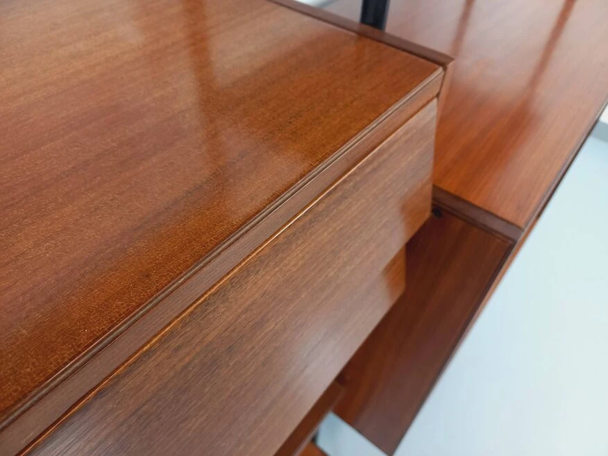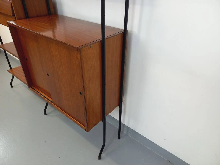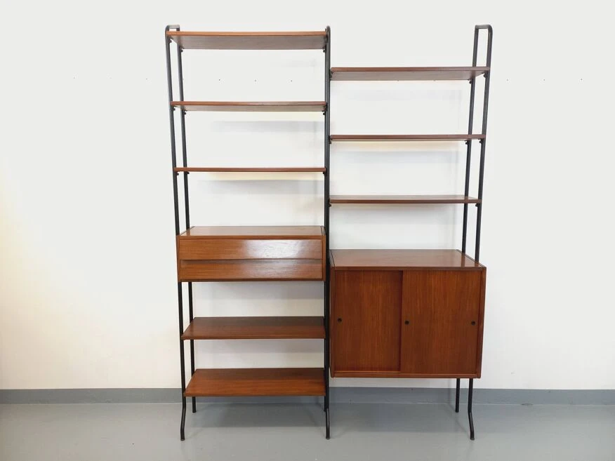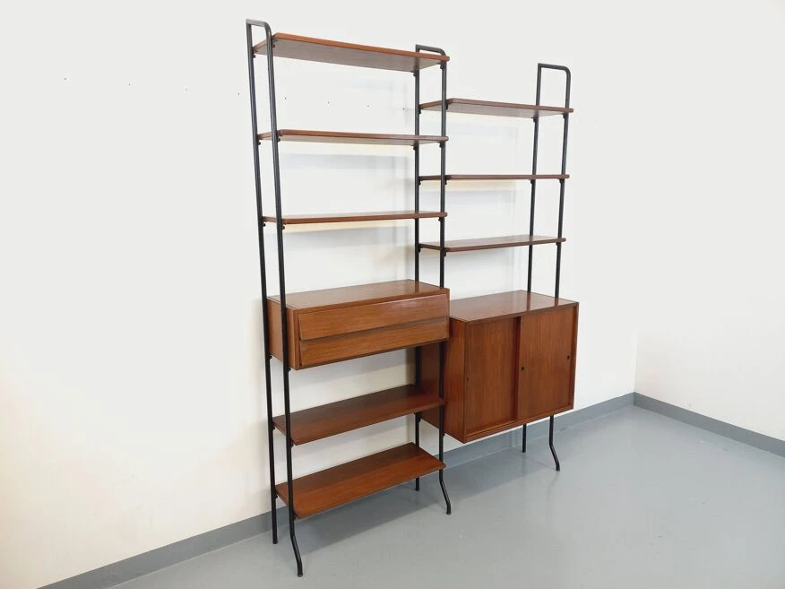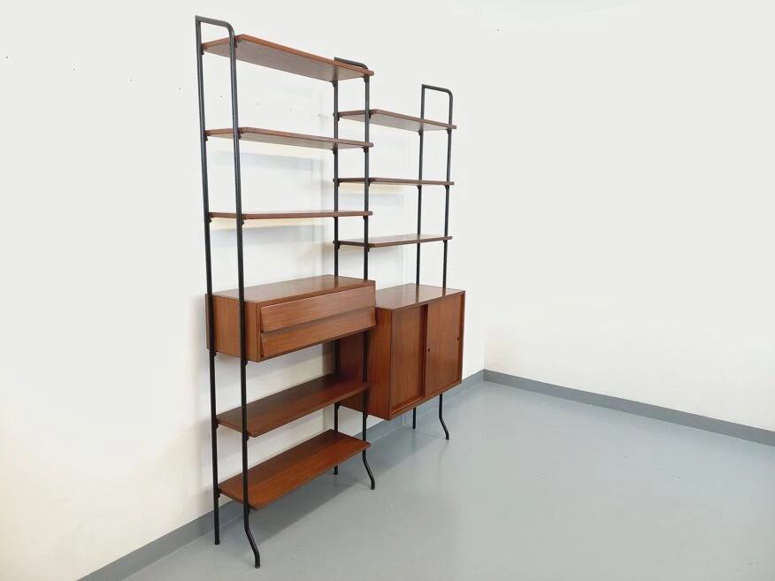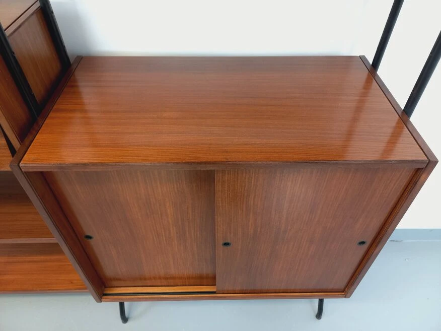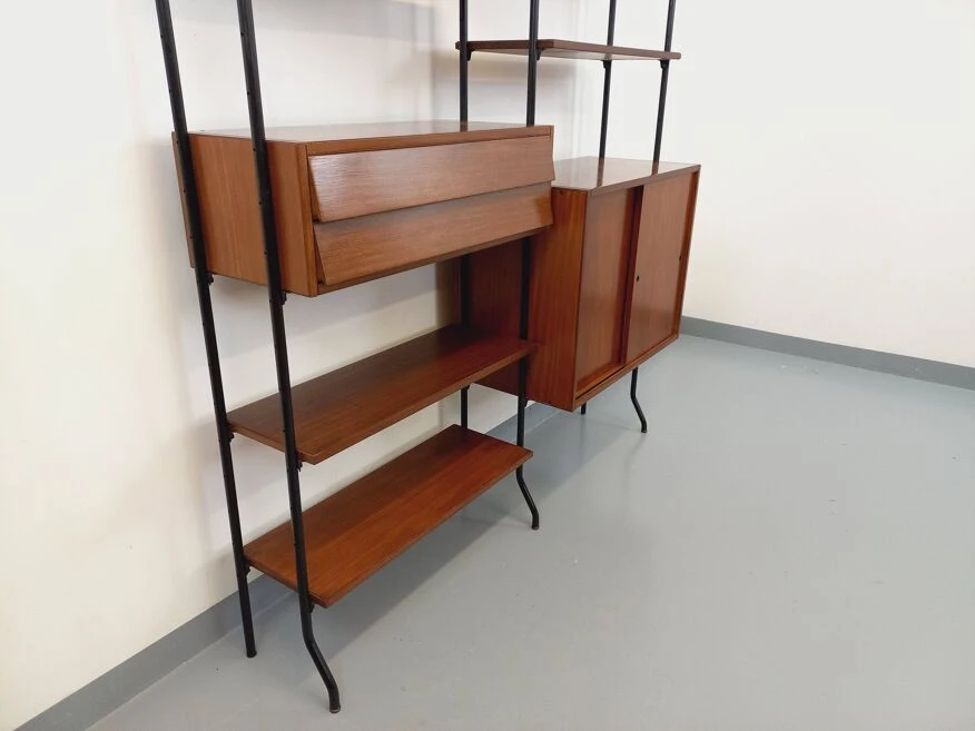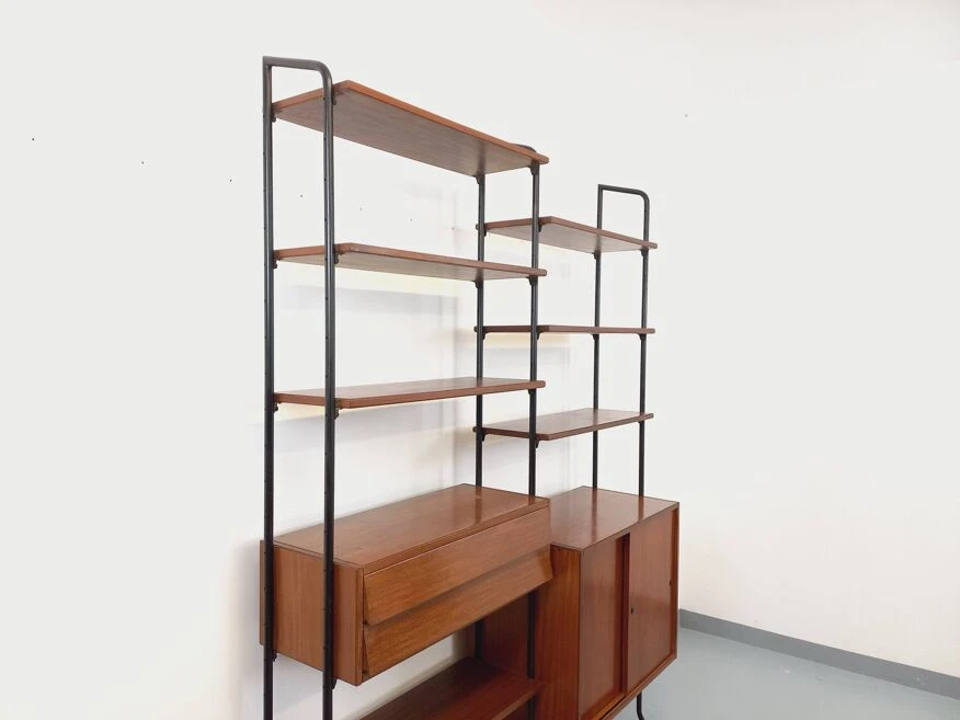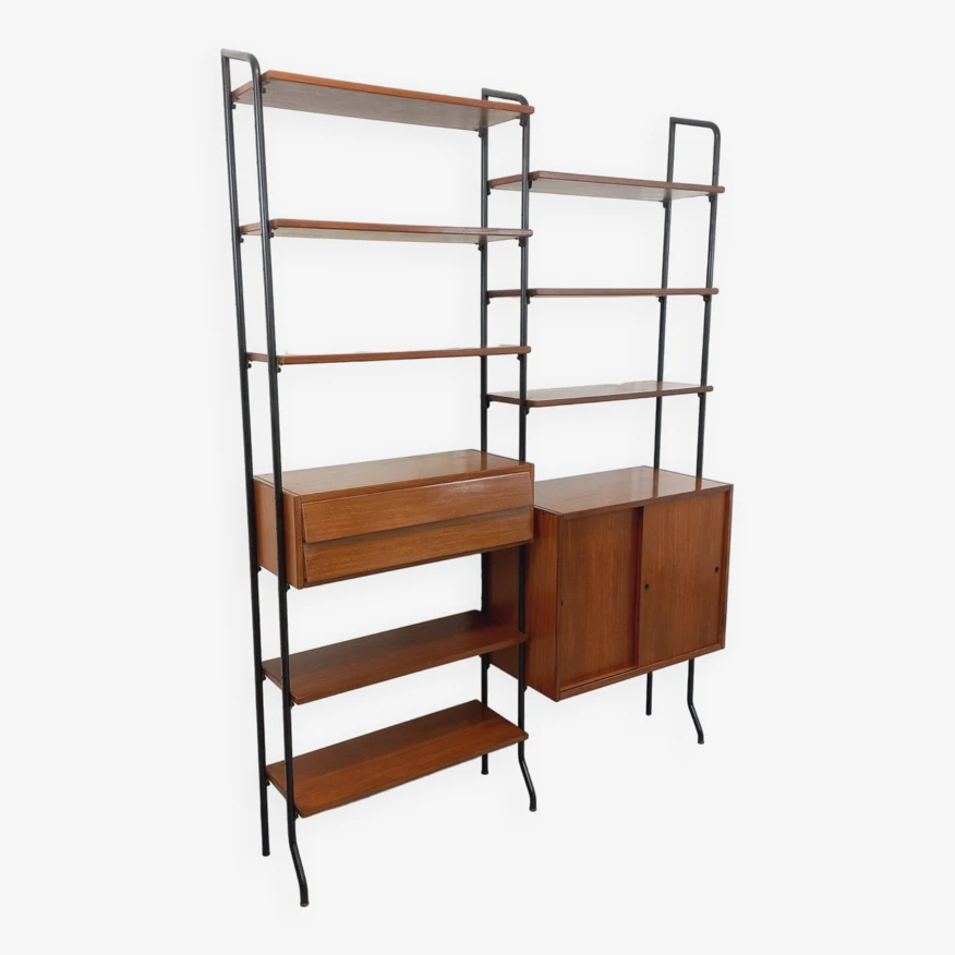 Vintage modular bookshelf in scandinavian style from the 60s, in 2 parts, italian design, in teak and black metal, 8 open shelves, 1 box with 2 sliding doors with shelf, 1 box with 2 pretty drawers with leaning design, which can be used as a small desk standing.