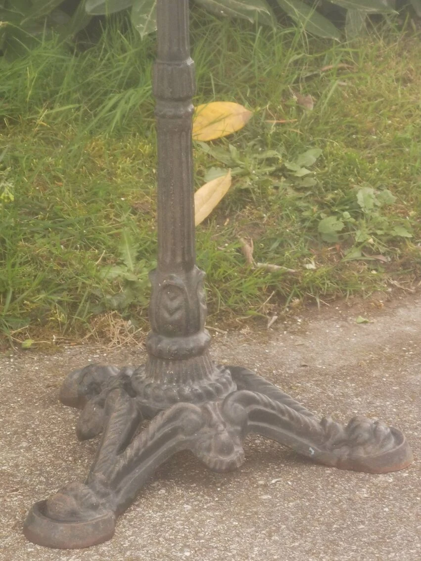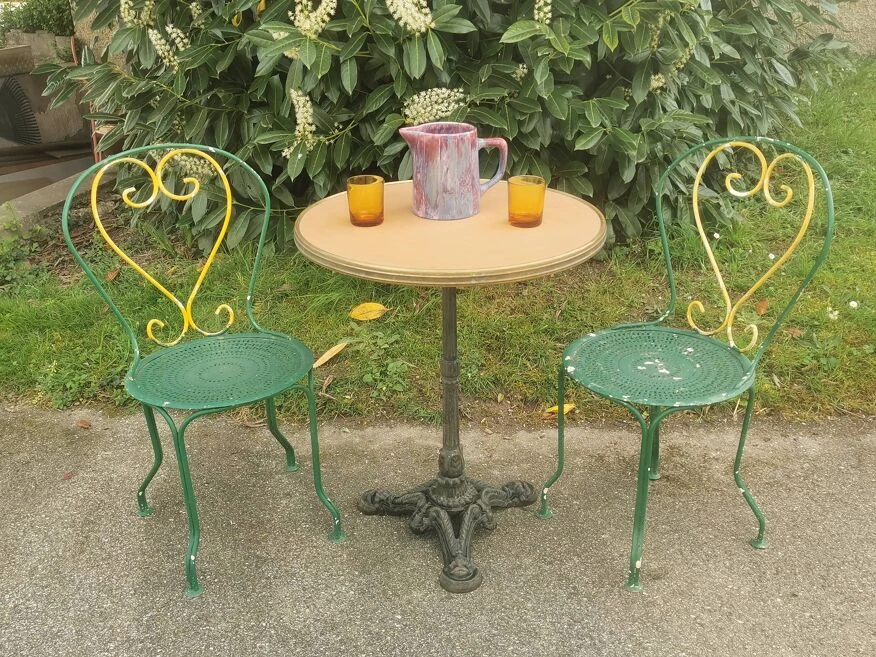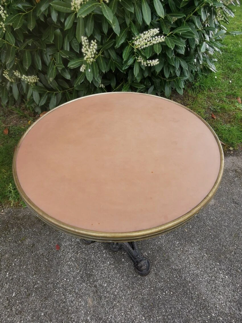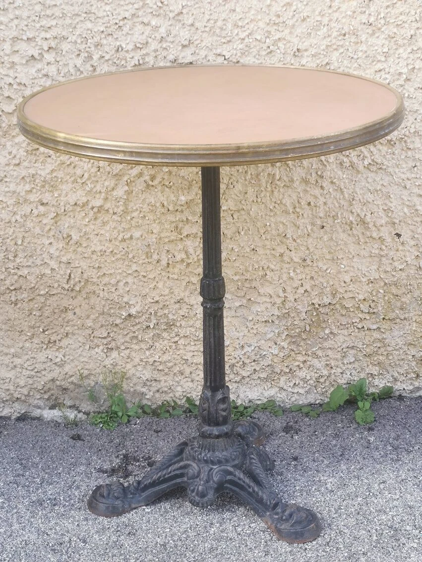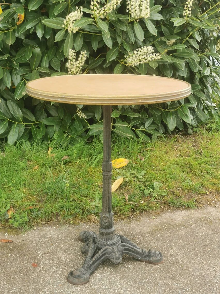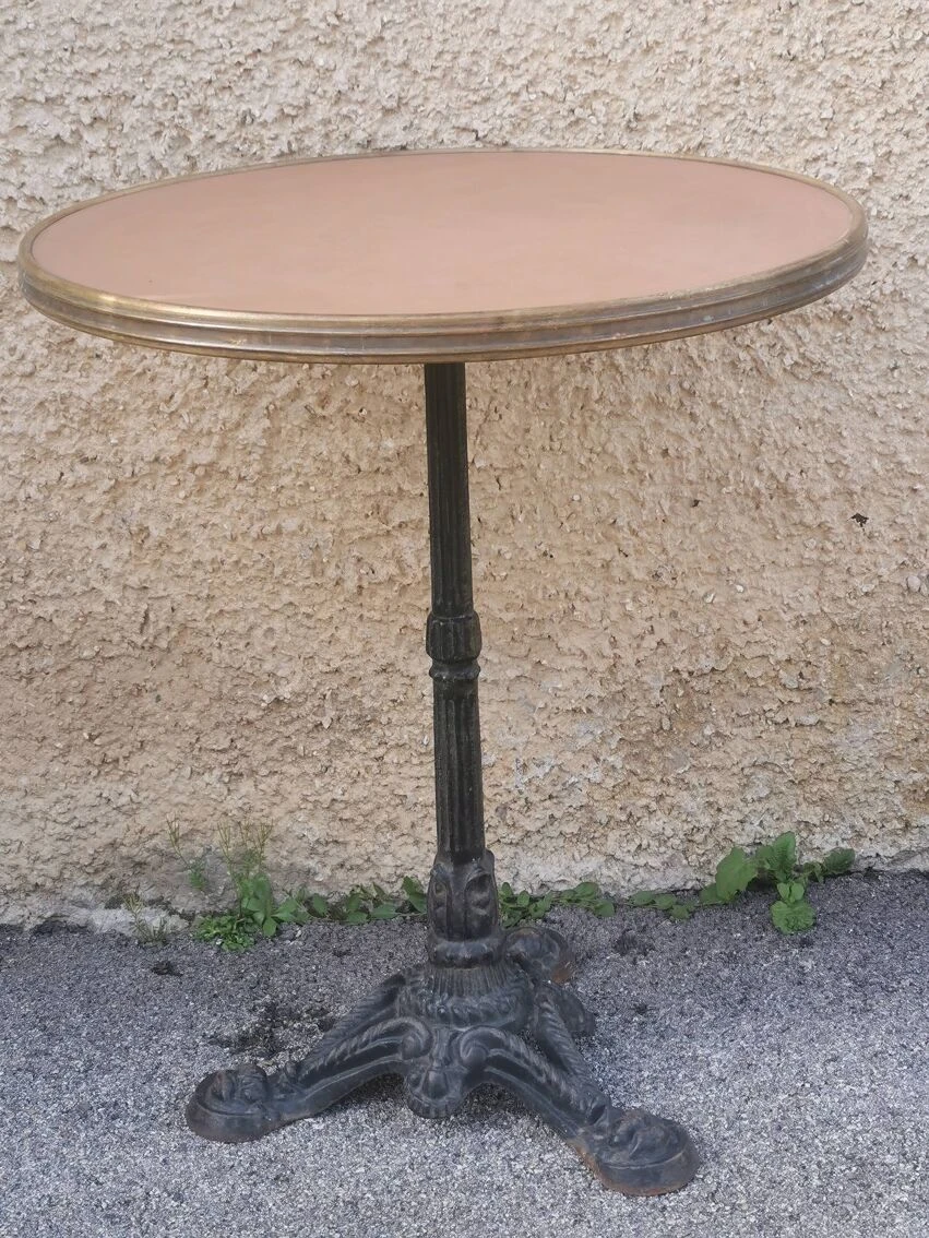 Vintage bistro pedestal table “cast iron base” Old Parisian bistro/brasserie pedestal table with its black cast iron base. Light brown melamine top, surrounded by a brass belt. Tray diameter 60 cm. Height 71.5 cm. Some slight traces of use but overall good condition for this timeless terrace/balcony table.