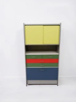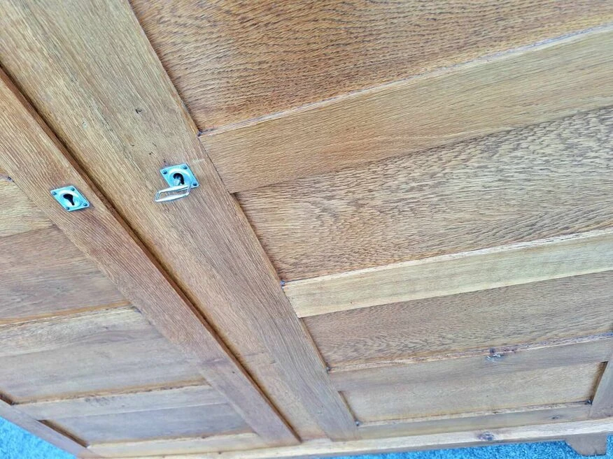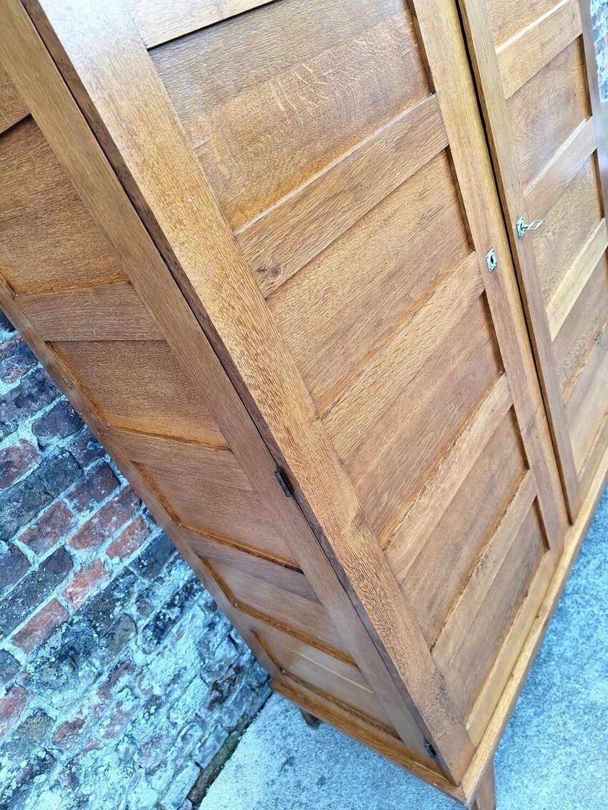 Vintage René Gabriel wardrobe, old wardrobe furniture known as disaster victims Attention, delivery dismantled because too heavy. Belonging to so-called reconstruction furniture, it is part of the so-called disaster furniture, offered after the war to families who lost everything following the bombings. Dimensions 130x50xh174cm. Solid oak and oak veneer. 1 original key, functional locks. Compass feet. Normal traces of use and age: discoloration and coloring of the wood, discreet dents and scratches, some window veneers slightly creased in places (see photos). Very good storage capacity, good general condition. One side of shelves, one side of wardrobe. The wardrobe can be arranged differently by you.