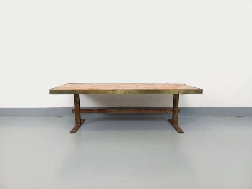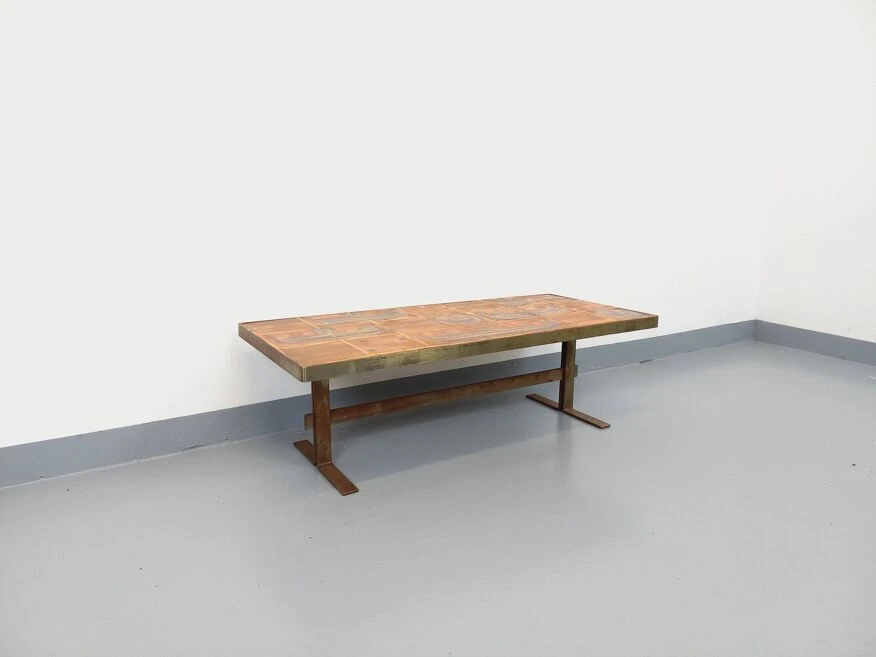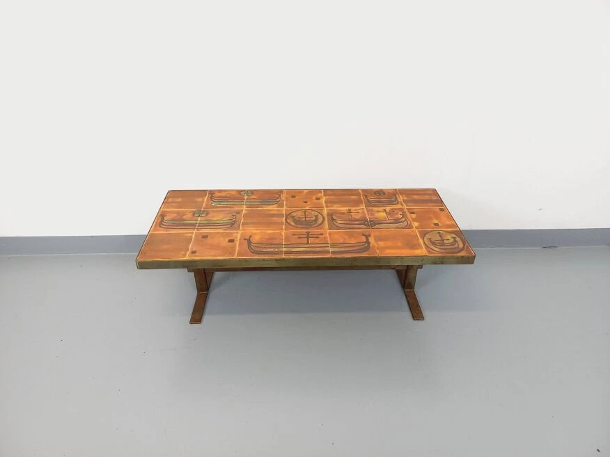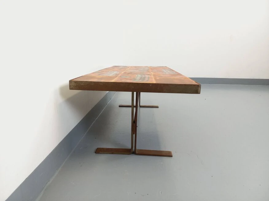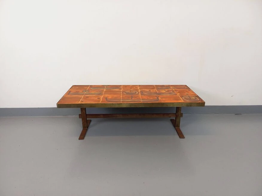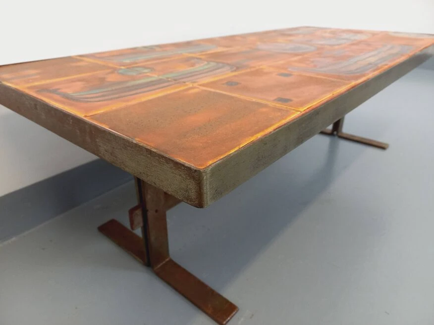 Vintage coffee table from the 70s, roche-bobois style, very beautiful design of the steel base, rectangular top with very pretty vallauris ceramics with colorful patterns (boats and boats) in ocher, orange and turquoise tones, with plays of contrast between matte enamel and shiny enamel.