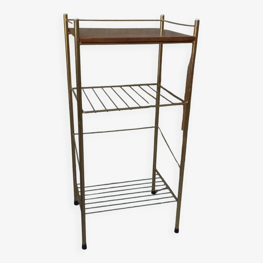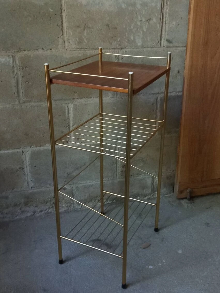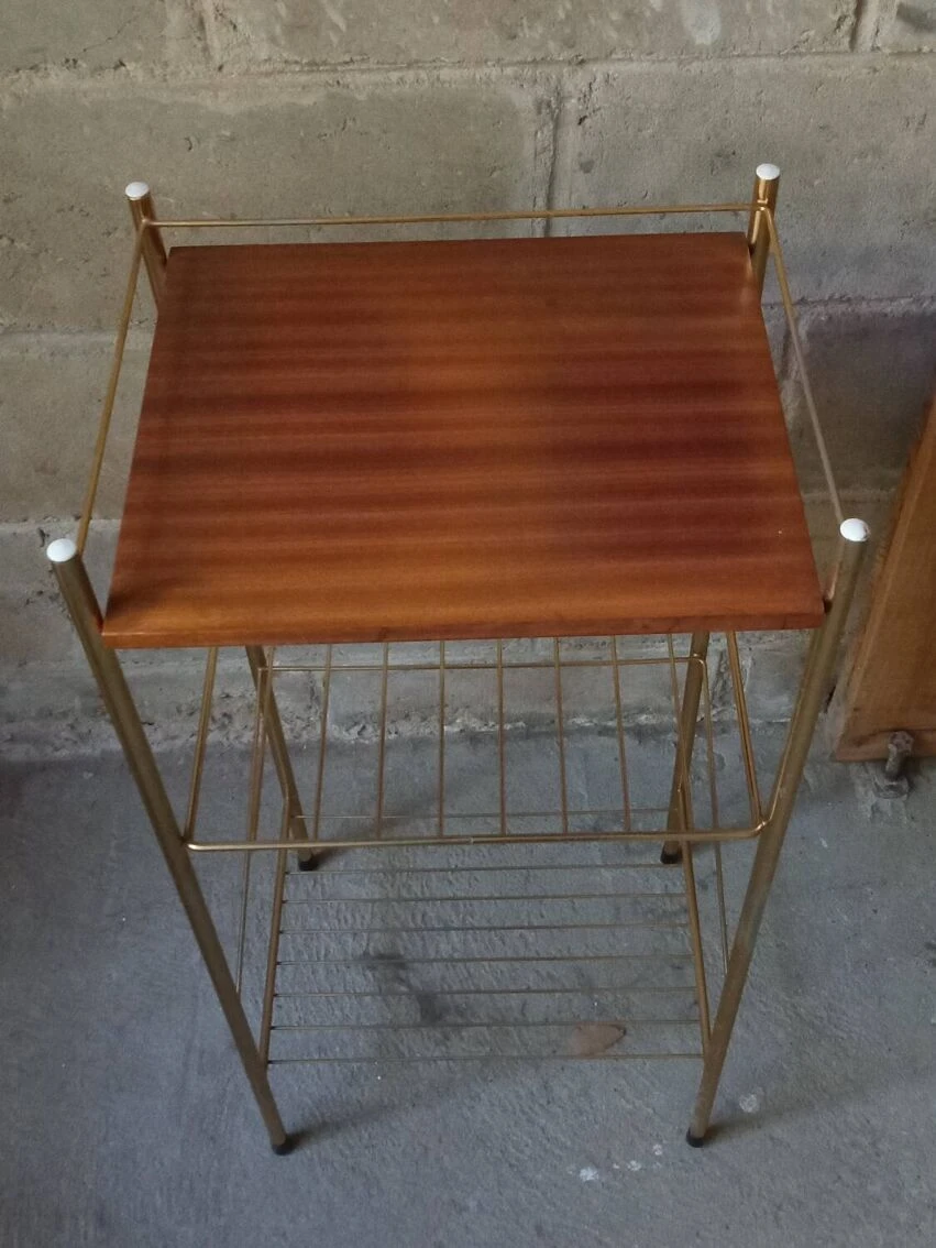 Small side table with book shelves, veneered wood top, gold metal structure.
