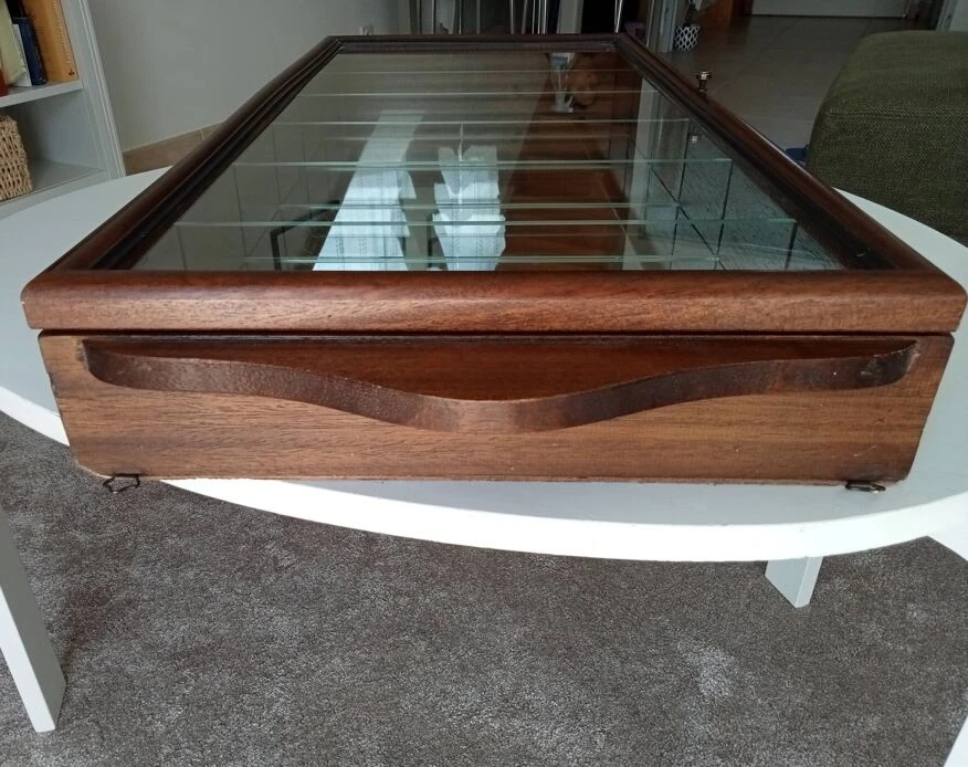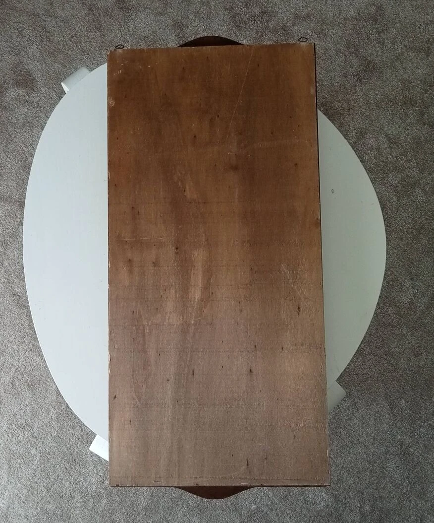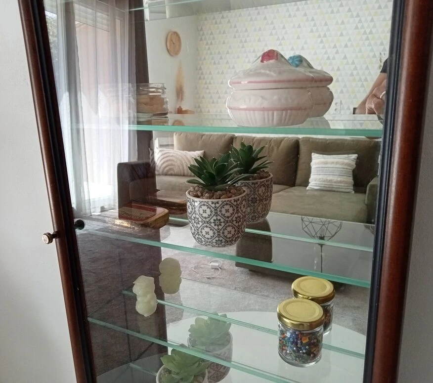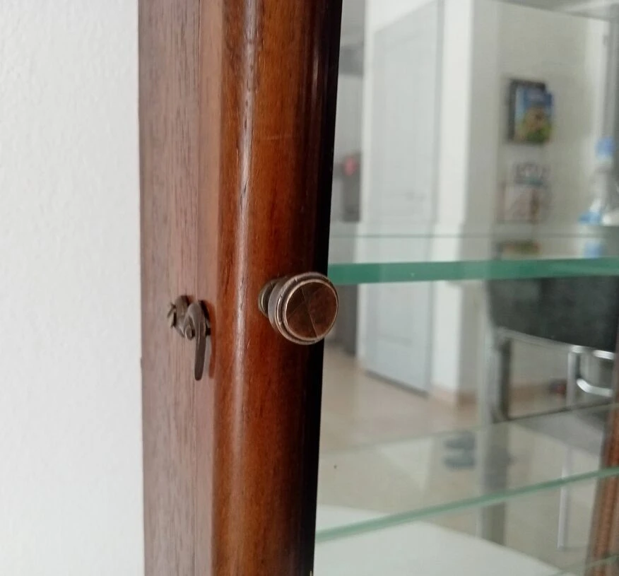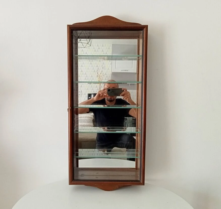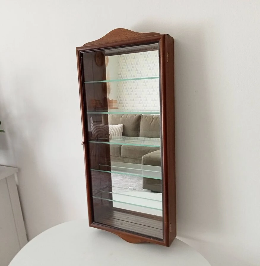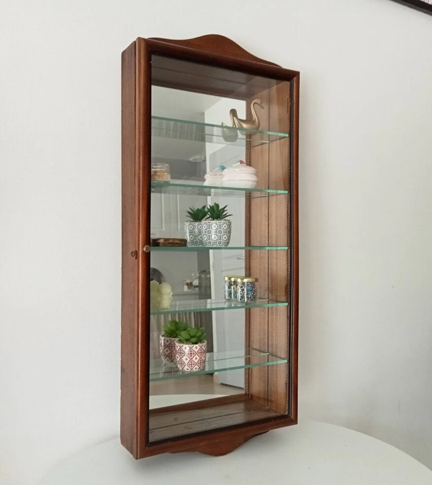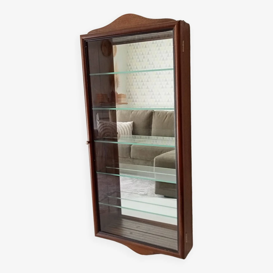 Elegant vintage wall display cabinet in wood (oak) from the 60s, with mirror in the background, 5 thick glass shelves, brass handle and latch, original fixing hooks, in good condition, minimal traces of use which have no effect on the aesthetics of the piece, no snags, no gaps.