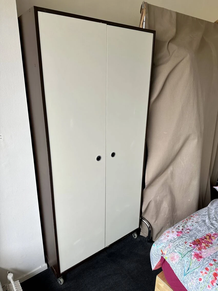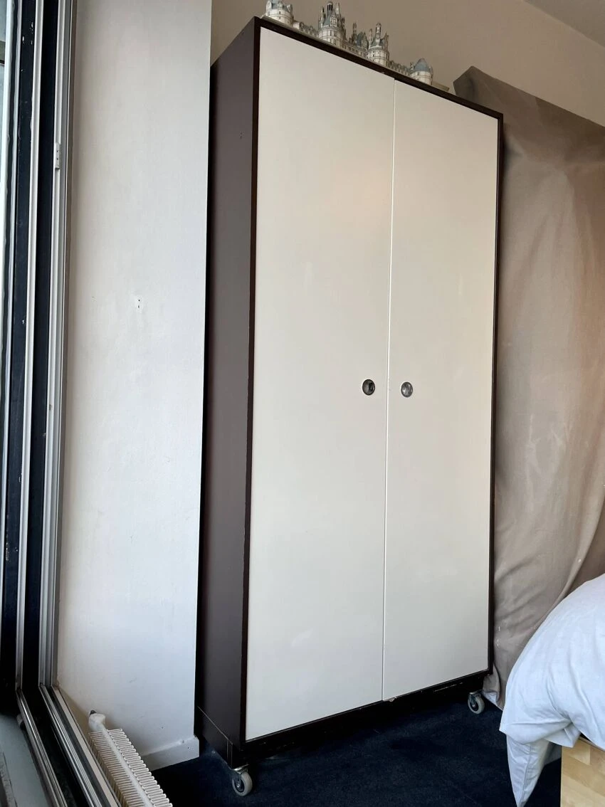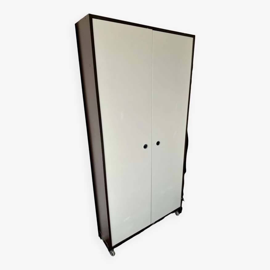 This is a magnificent authentic vintage wardrobe, chocolate and ecru colors, which comes directly from the 70s. This furniture with extraordinary qualities, as practical and modular as it is aesthetic, was purchased by my maternal grandparents who always attached great importance to quality. Wardrobe with 2 magnetic doors, 1 upper shelf and 1 very practical telescopic rod, resting on a very solid frame with casters! Dimensions in cm: Width 80, Depth 41, Height without casters 160 (with casters 171). These items are authentic and belong to me. Objects contained in this piece of furniture are not included, except the rolling stand. Thank you for your confidence.
