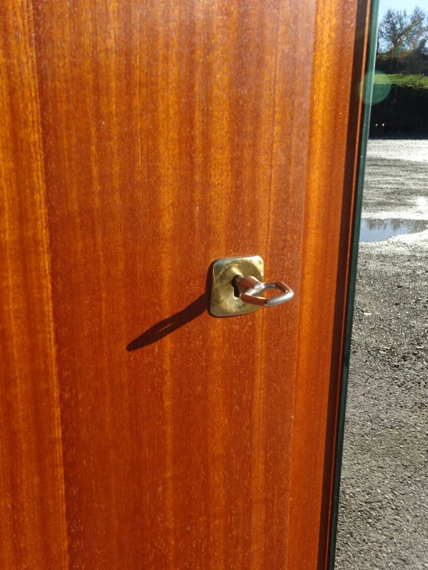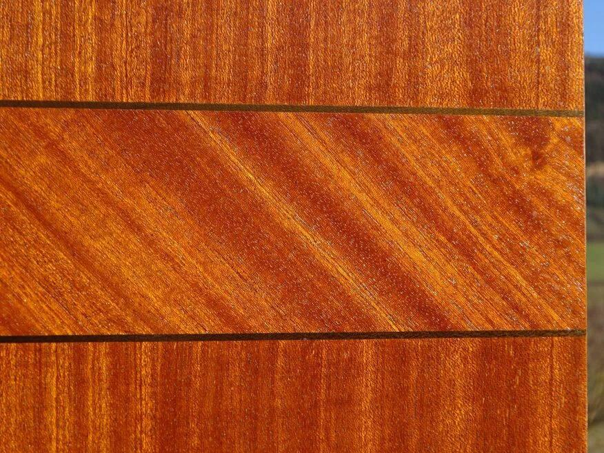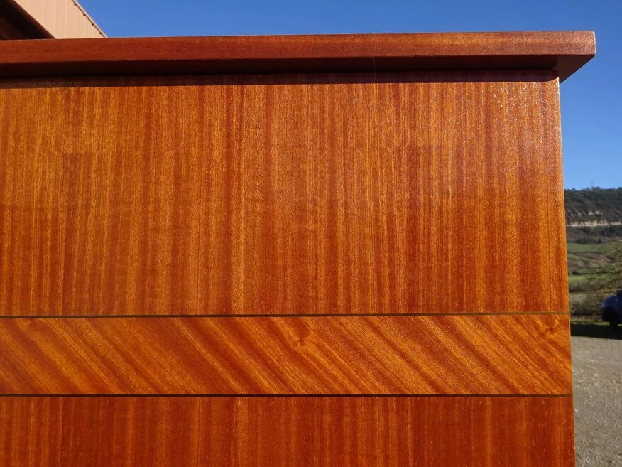 Mahogany exterior with inlaid frieze on the doors, pretty natural reflections in warm color tones.