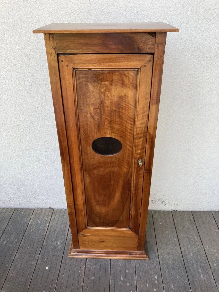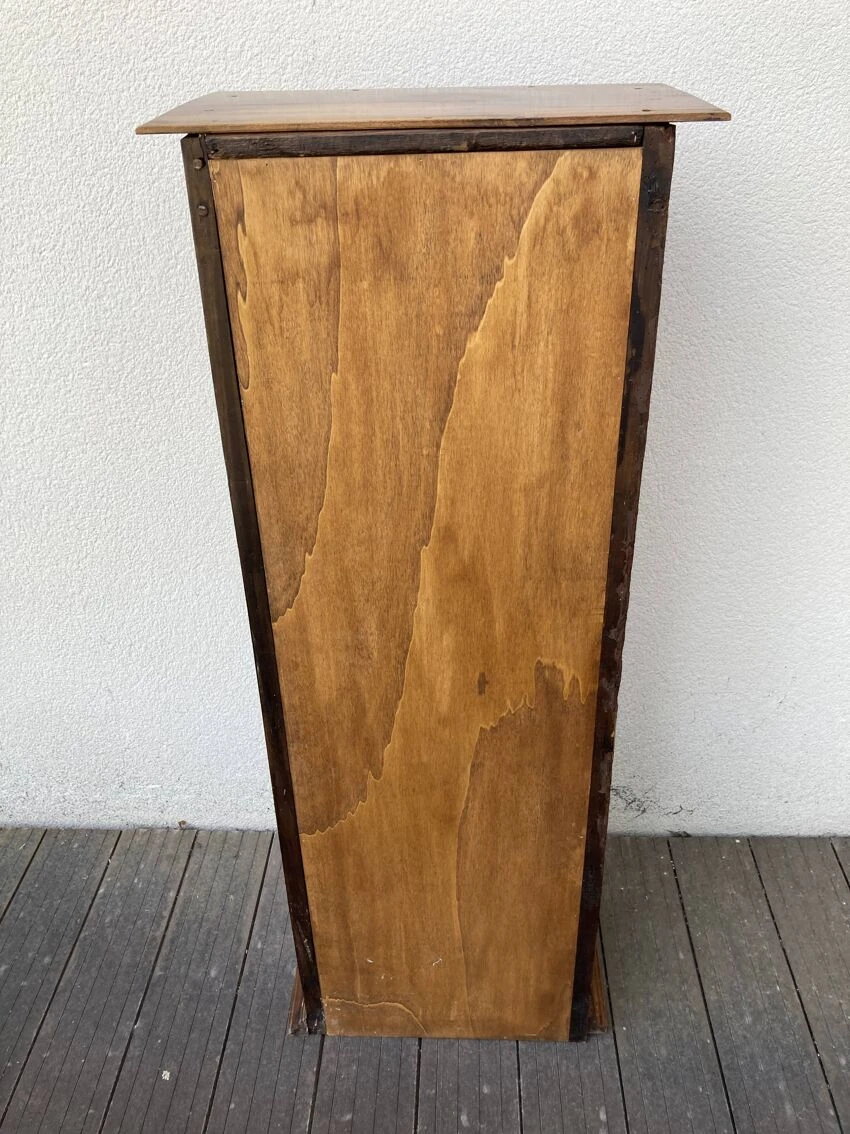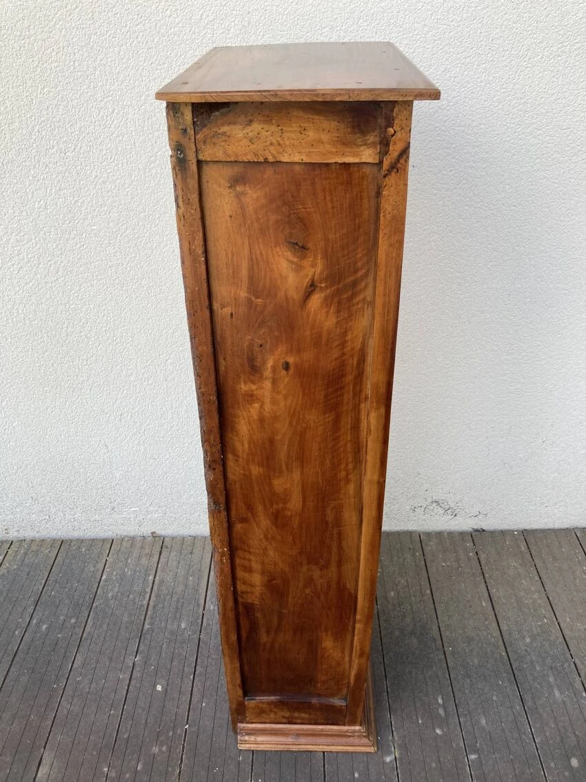 It is a solid walnut clock cabinet dating from the 18th century which has been used as a library. It has two adjustable shelves. She is fully pegged and in her juices. Worm holes are visible but it has been treated and no longer contains any parasites. It was polished with a buffer. The bottom shelf is cracked but this does not affect use. Height: 126 cm, depth at the top 30 cm and width 49 cm. Weight 17 kg.