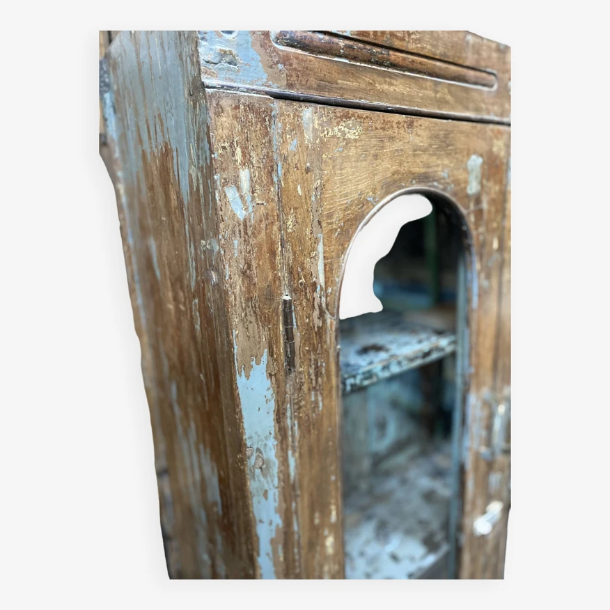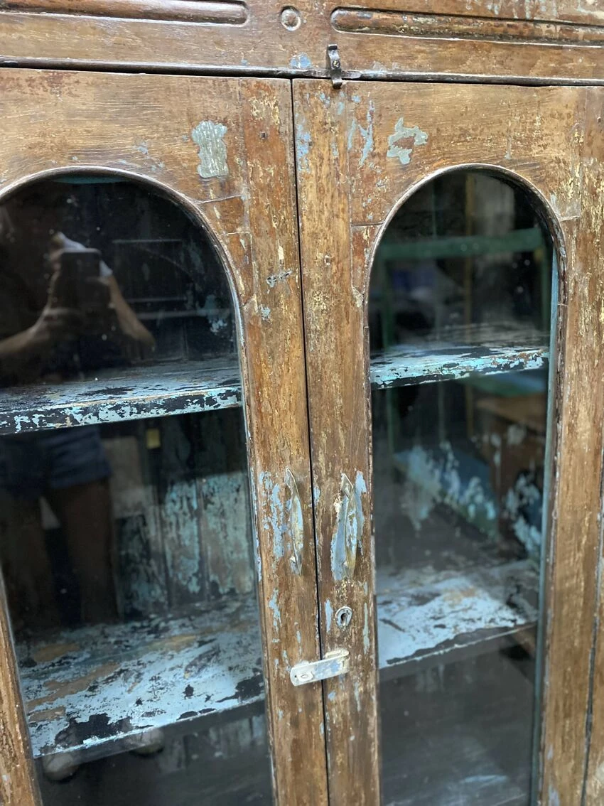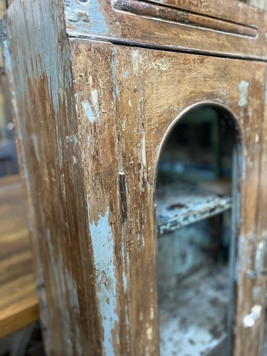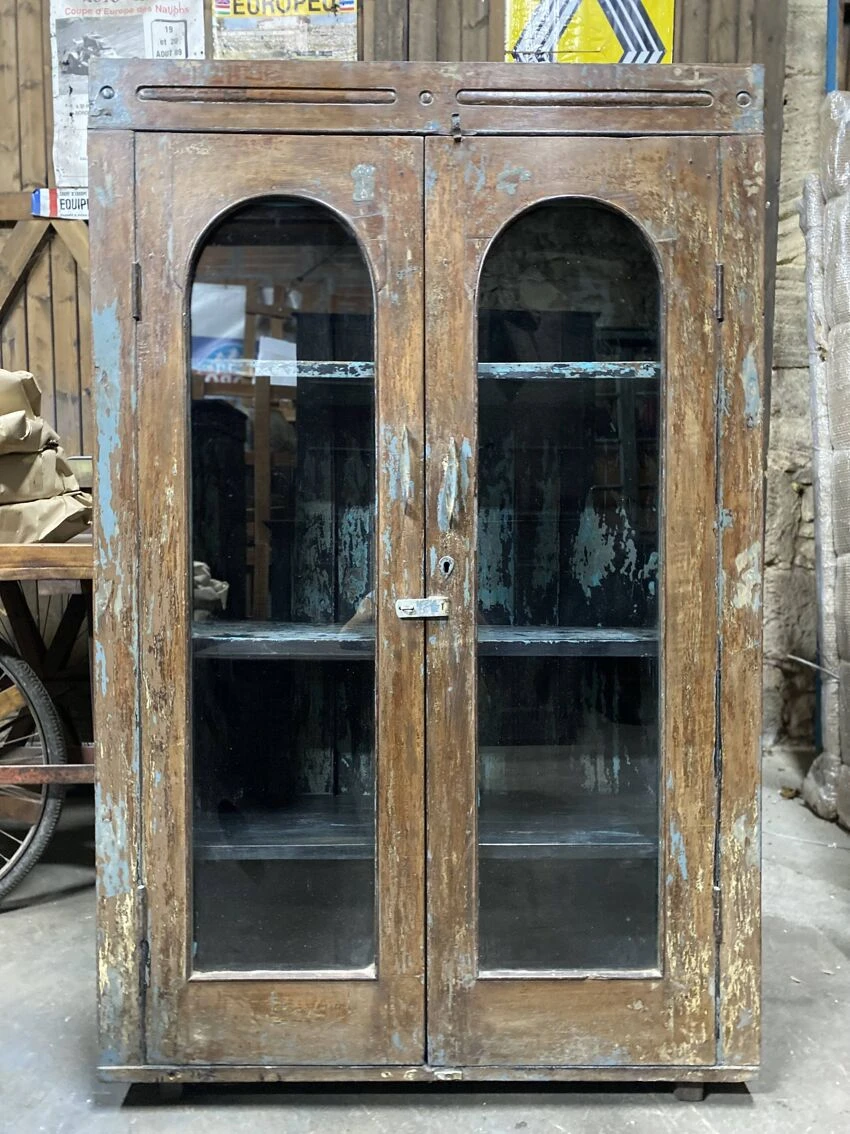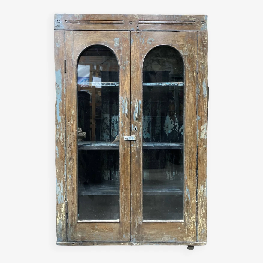 Vintage Display Cabinet Sublimated In Verdigris, 2 Doors With Beveled And Cut Windows, Wooden Top.