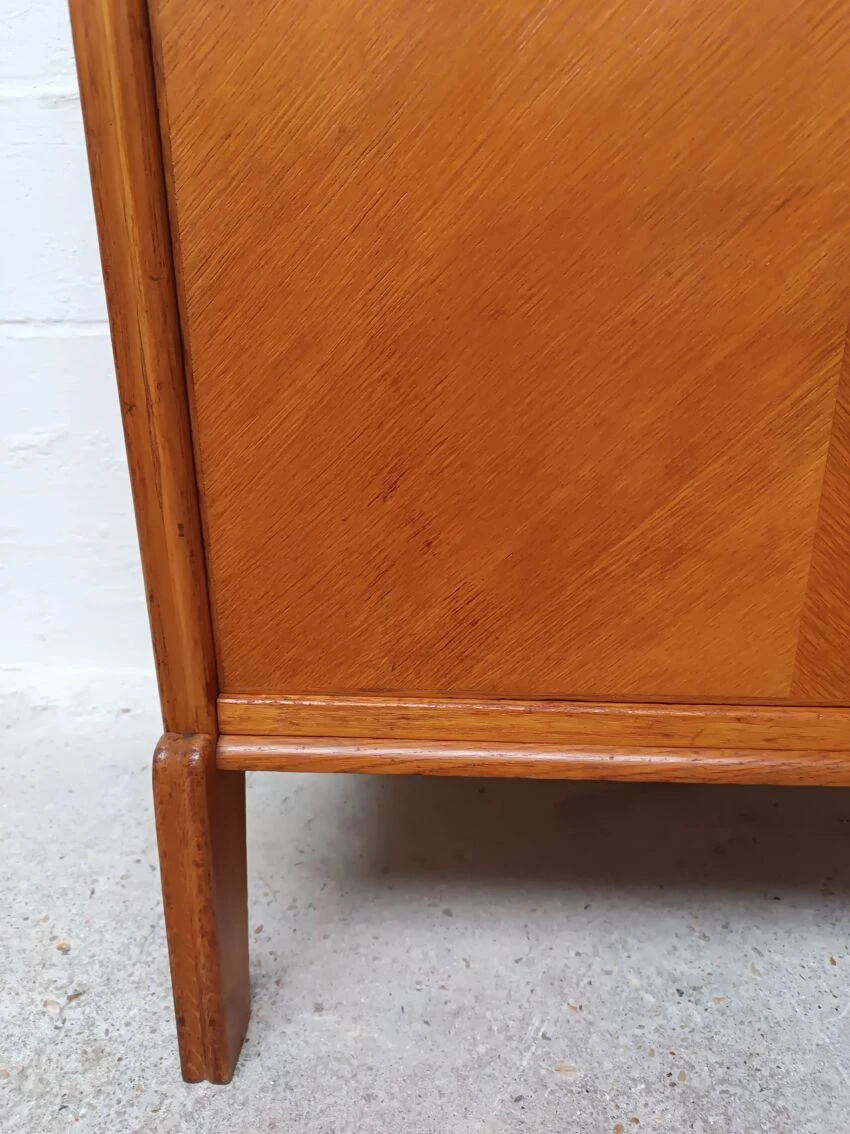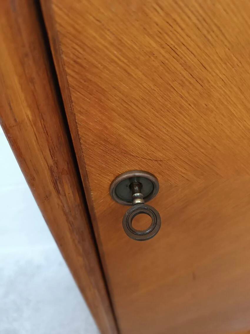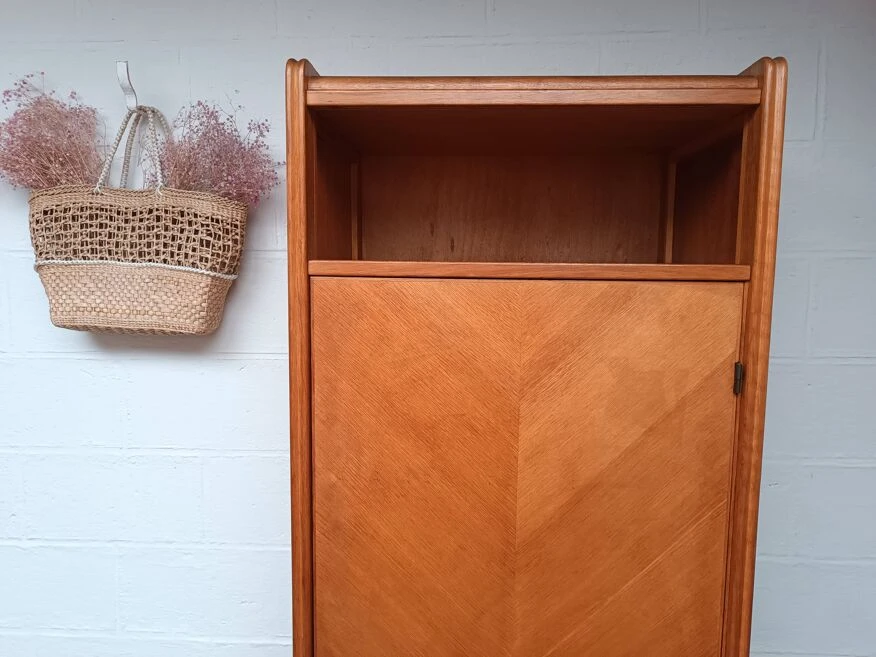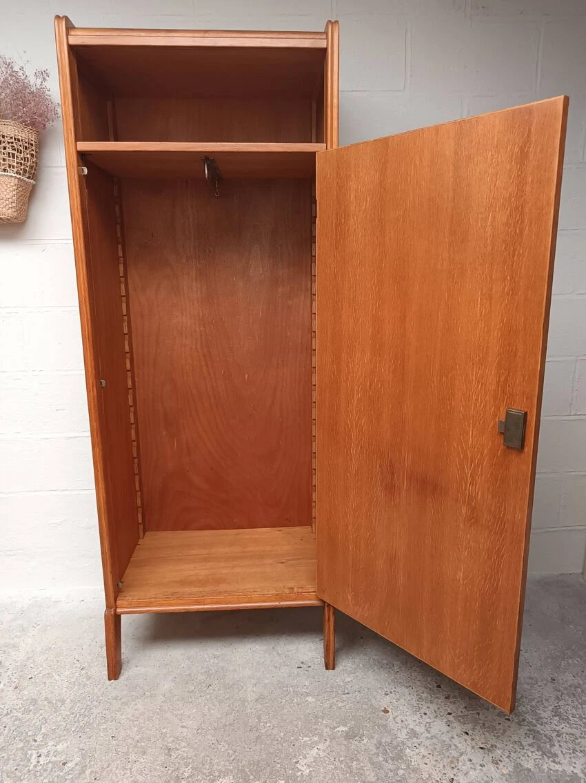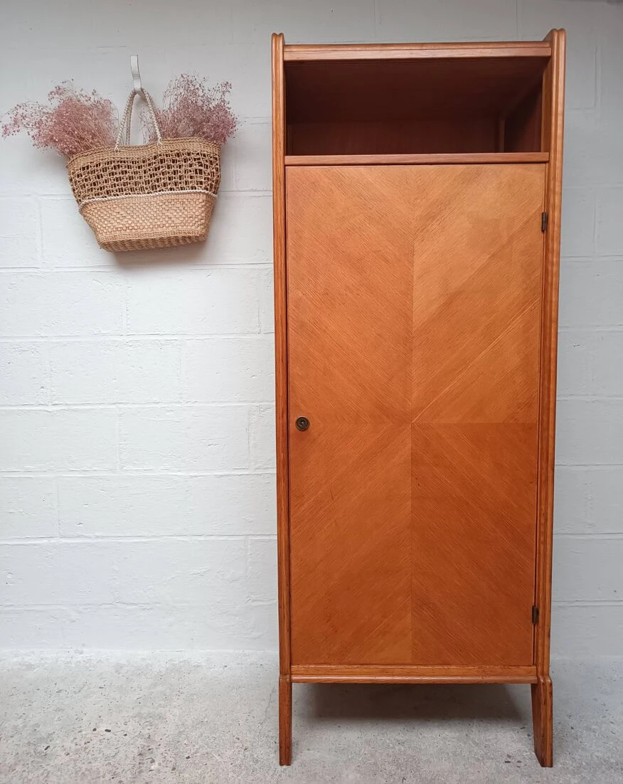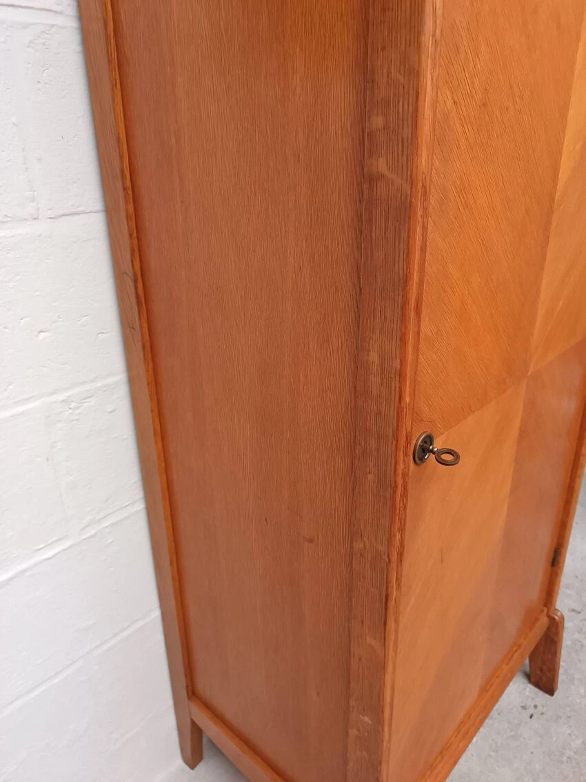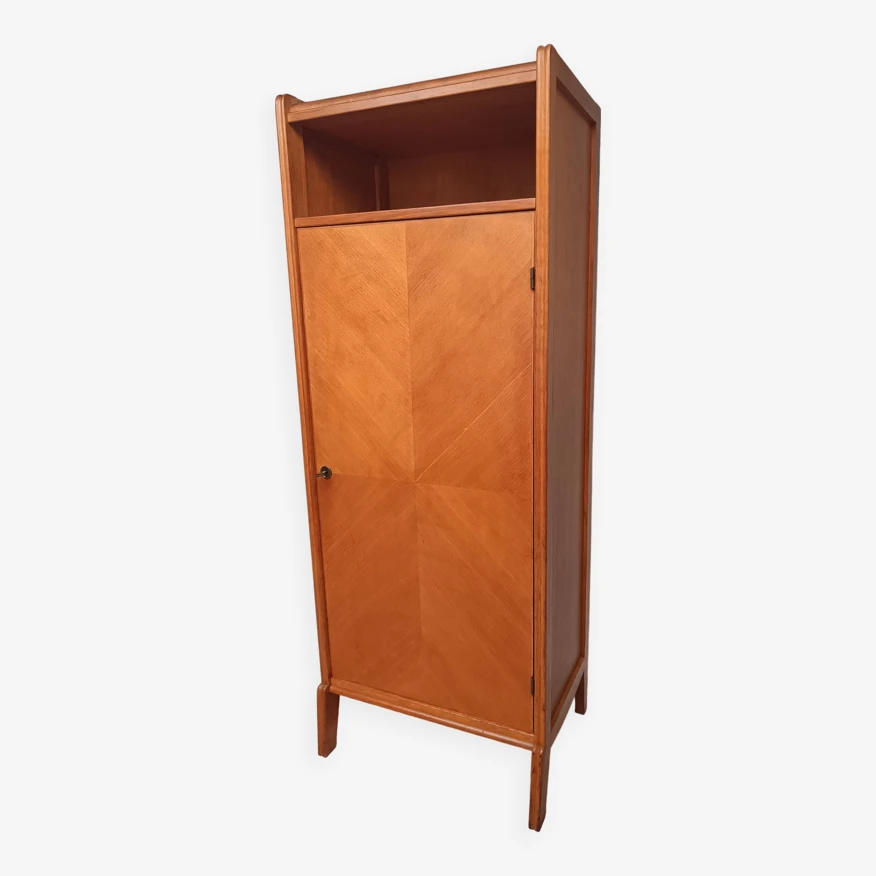 Very beautiful oak locker room 1950 fin shape with integrated wardrobe and its original key beautiful finish, original golden honey patina very good condition with some traces of wear and time (see photos) very beautiful piece and lots of charm dimensions: height 171 cm width 66 cm depth 45 height niche at top 21 cm.